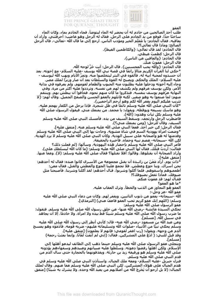 كتاب العفو هو نص قصير يعالج موضوع العفو والمغفرة من منظور إنساني وروحي. يتناول الكتاب أهمية العفو كقيمة عالية في العلاقات الإنسانية، حيث يسعى إلى توضيح كيف يمكن للمغفرة أن تساهم في تحسين النفس وتعزيز السلام الداخلي. يستعرض النص الأبعاد النفسية للعفو وتأثيره على الفرد والمجتمع، مما يساعد القارئ على فهم ضرورة تجاوز الأحقاد والصراعات. يشدد الكتاب على أن العفو لا يعني التنازل عن الحقوق، بل هو اختيار طوعي يسهم في الشفاء الشخصي والعلاقات السليمة. من خلال أمثلة وتجارب إنسانية، يبرز الكاتب كيف يمكن للعفو أن يكون دافعًا للتغيير الإيجابي، ويحفز القارئ على التفكير في تجاربه الشخصية وتبني موقف العفو كأسلوب حياة. يتاج الكتاب للقارئ فرصة للتأمل في معاني العفو وكيف يمكن أن يكون محورًا لتحقيق السلام الداخلي والسعادة.