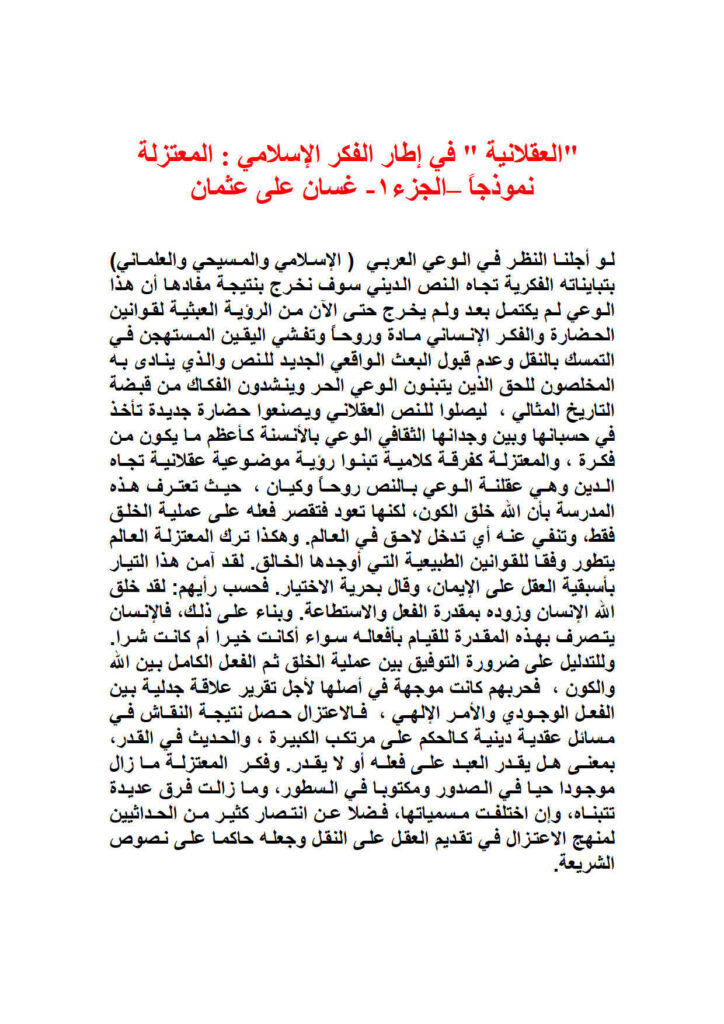 العقلانية في إطار الفكر الإسلامي _ المعتزلة نموذجاً ( الجزء الأول)
